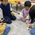 雨の日のリトミック スカーフを傘に見立てました。カエルさんもぴょんぴょん