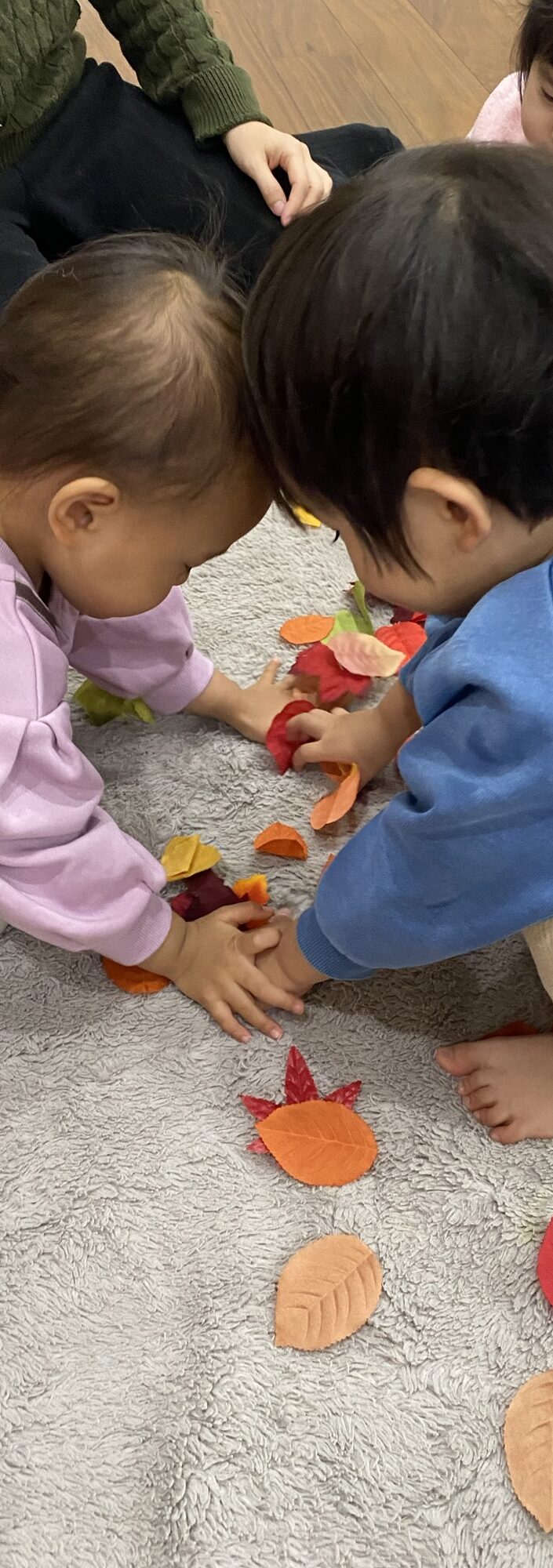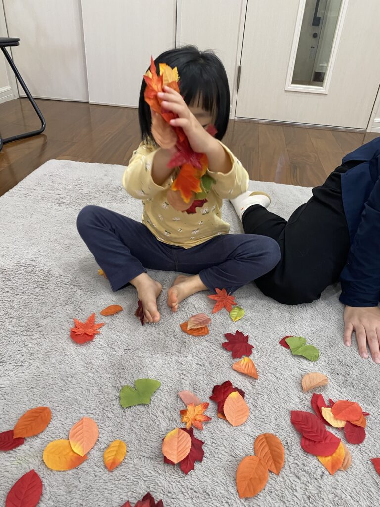 落ち葉で遊んだり、制作は秋のきのこです。